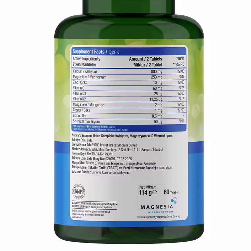 Nature’s Supreme Osteo Complex, kalsiyum, magnezyum ve çinko gibi minerallerin yanı sıra D ve K vitaminlerini içeren çok bileşenli bir formüle sahiptir. Bu içerikler tek üründe bir araya getirilerek kullanıcıya farklı besin öğelerini birlikte alma imkânı sunar. Ürün, mineral ve vitamin kombinasyonu sayesinde günlük rutinlere kolayca eklenebilecek bir takviye edici gıda olarak tasarlanmıştır. Tablet formu sayesinde taşıması ve günlük kullanımı pratiktir.